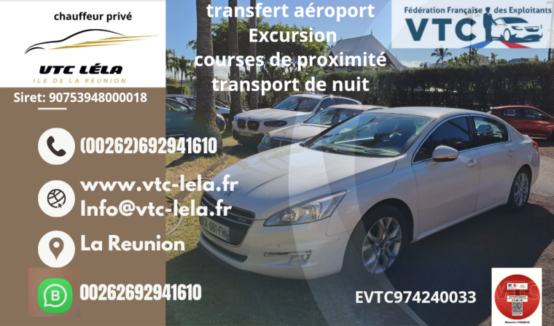 Vtc lela est votre partenaire de transport de confiance à La Réunion, offrant une gamme de services adaptés à vos besoins. Avec une équipe de chauffeurs professionnels et une flotte de véhicules modernes, nous nous engageons à fournir un service de qualité supérieure à un prix abordable. Que vous ayez besoin d'un transfert vers l'aéroport, de visites guidées de l'île ou de transport privé, notre priorité est votre satisfaction. Nous nous efforçons de rendre chaque trajet agréable et pratique, en faisant de votre confort et de votre sécurité notre priorités.